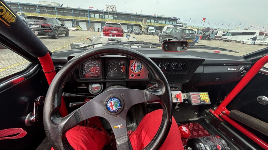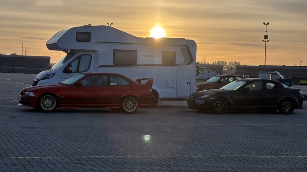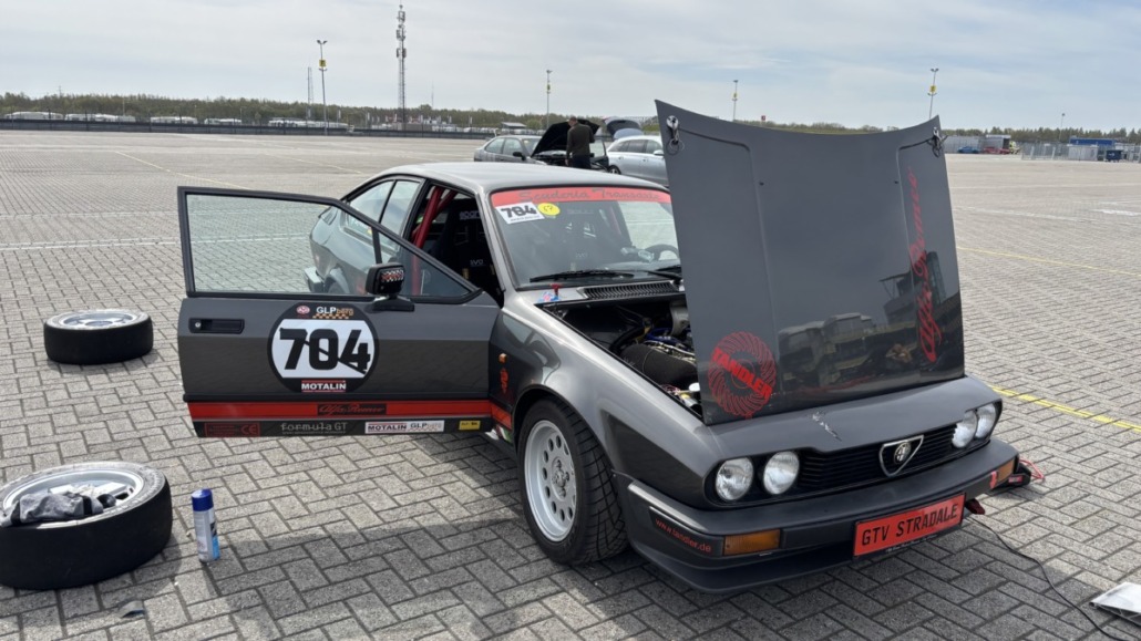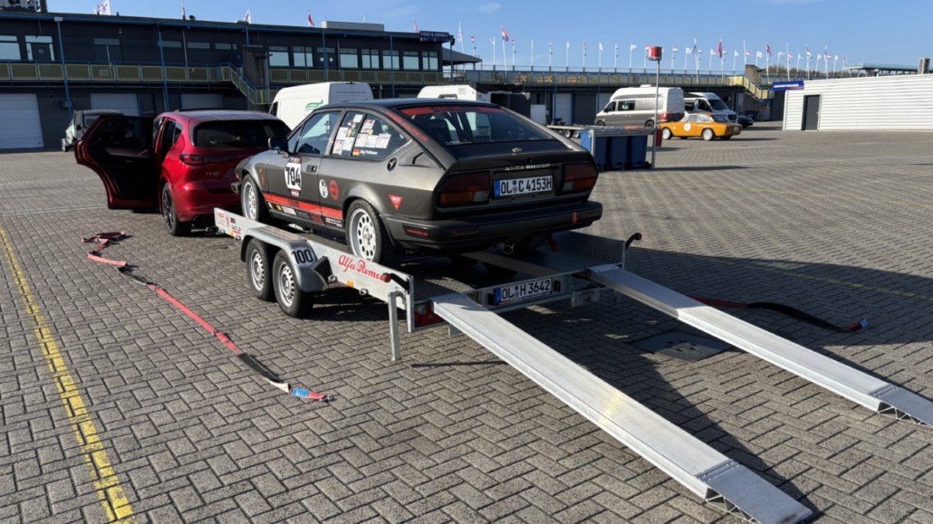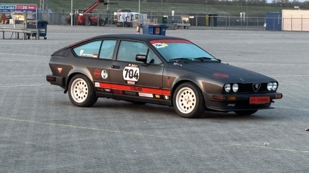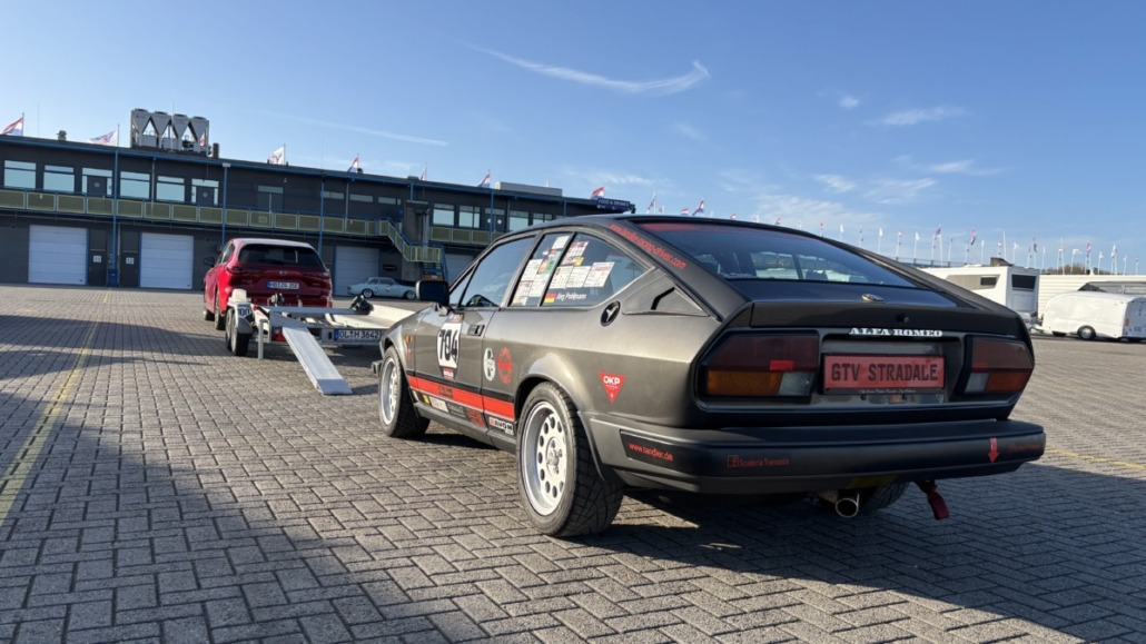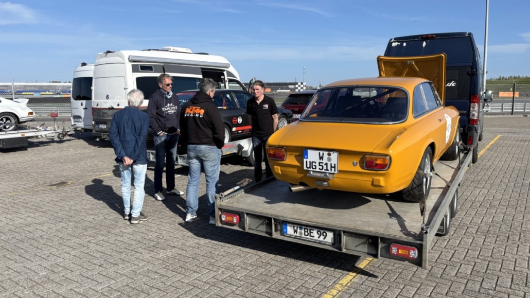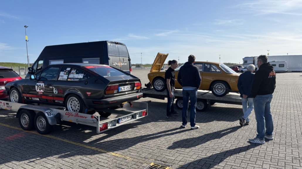 Testfahrten auf einer echten Rennstrecke in familiärer Atmosphäre, und dann noch bei blauem Himmel – gibt es etwas Schöneres? Wie jedes Jahr hatten Michael Küke und Robert Marx wieder den TT-Circuit in Assen gebucht und damit abermals zahlreiche Motorsportenthusiasten auf zwei und vier Rädern in die Niederlande gelockt. Am Sonntag, den 26.05.2026 ab 17:00 Uhr, trudelten nach und nach ein Großteil der Teilnehmer im Fahrerlager ein, zum Teil auf eigener Achse, zum Teil mit dem Renner auf dem Trailer. Zunächst ging es ans Abladen, Aufbauen und zur Registrierung. Auch ich lud die inzwischen 42 Jahre alte TANDLER Alfa Romeo GTV 2.0 Stradale ab und richtete mir mein traditionelles Nachtlager im Kofferraum des Zugfahrzeugs ein. Danach wurden die anderen Teilnehmer begrüßt. Es gab viele bekannte, aber auch einige neue Gesichter.