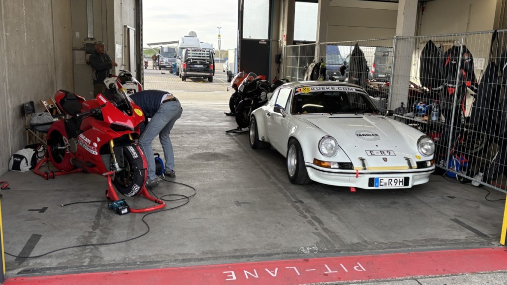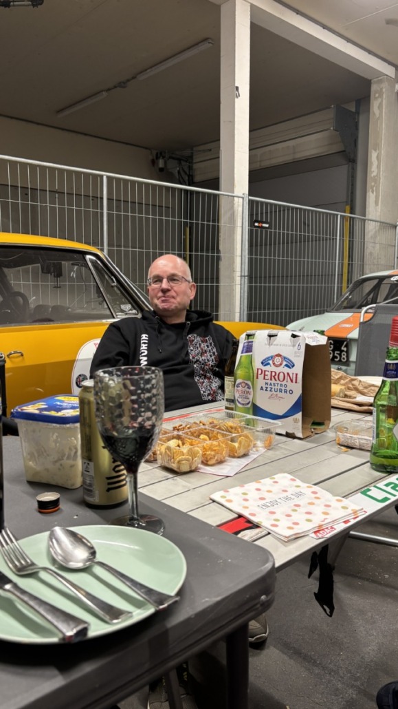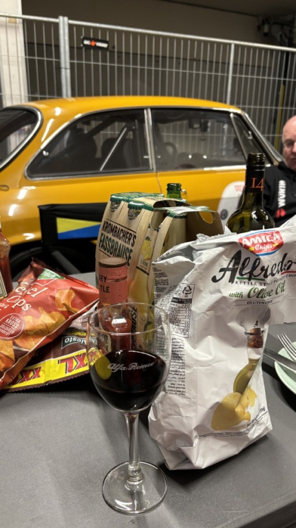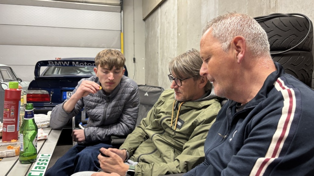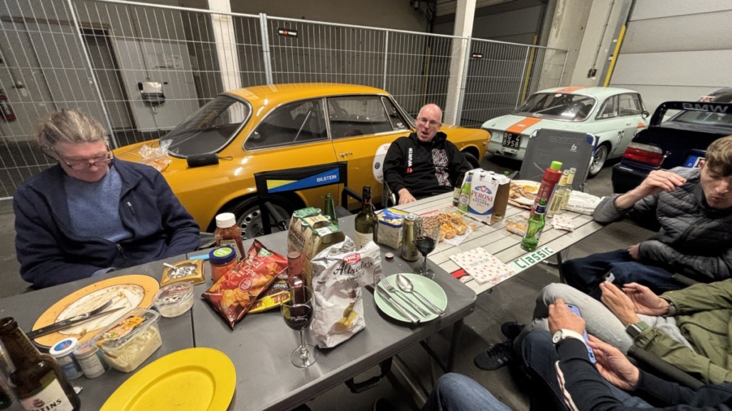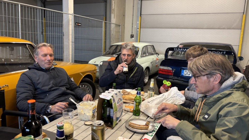 Gemütlich wurde es dann beim gemeinschaftlichen Grillen, wegen der Temperaturen nahe am Gefrierpunkt, dieses Mal in der Box. Dabei gab es natürlich benzinhaltige Gespräche, Geschichten aus goldenen Motorsportzeiten und viel gute Laune.