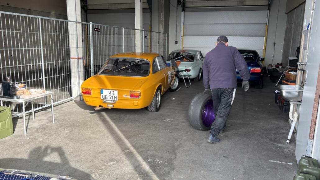 Nach der kalten Nacht (im Schlafsack war es aber gemütlich) und einem kleinen Frühstück samt Espresso vom Gaskocher gab es die obligatorische Fahrerbesprechung und dann ging es zum ersten Mal bei schönstem Wetter auf die Strecke. Also, sollte es auf die Strecke gehen. Denn der Alfa hatte andere Pläne und sprang erst mal gar nicht an – scheinbar (erneute) Zündungsprobleme. So wurde der Vormittag zur Schrauberstunde. Bei der Fehlersuche mit kompetenter und tatkräftiger Unterstützung durch Ulrich Gawlick von der Alfa-Zentrale stellte sich dann eine gebrochene Verteilerwelle des analogen Verteilers als vermeintlicher Übeltäter heraus. Also wurde der Verteiler (wieder mal) gegen den Programmierbaren von 123Ignition getauscht, wohlwissend dass auch dieser in der letzten Zeit nicht ganz problemlos lief. Da durch die zahlreichen Startversuche die Zündkerzen nass waren, mussten alle acht dann auch noch gereinigt werden und siehe da: Der Motor lief plötzlich und ich konnte am späten Vormittag endlich auf die Strecke, wo sich die anderen Teilnehmer schon stundenlang ausgetobt hatten. Nach dem Wechsel auf Slicks lief der Alfa dann einwandfrei und zügig, geradeso, als wäre nie etwas gewesen. Die rundenlangen „Duelle“ mit etwa gleichschnellen Autos (Ford Escort Mk1, BMW E36 325i, Alfa Giulia Sprint, …) haben viel Spaß gemacht und allen Teilnehmern war die Freude anzusehen. Die gewonnenen Erkenntnisse bei den Testfahrten können nun in die weitere Saisonvorbereitung einfließen.